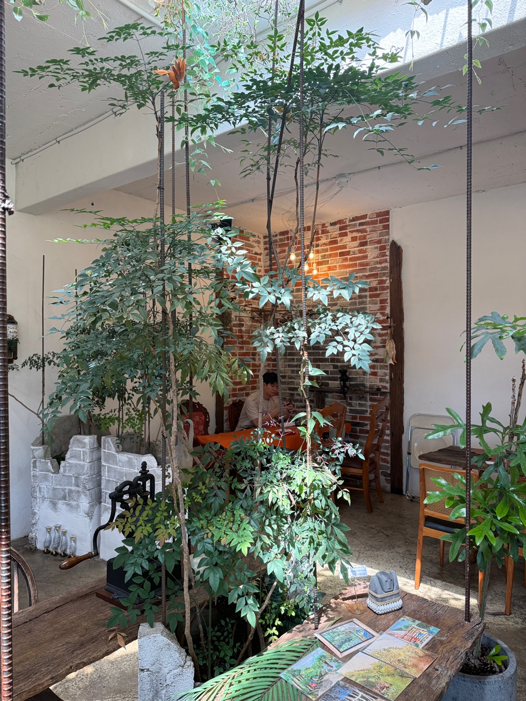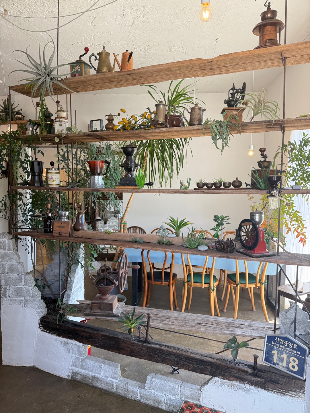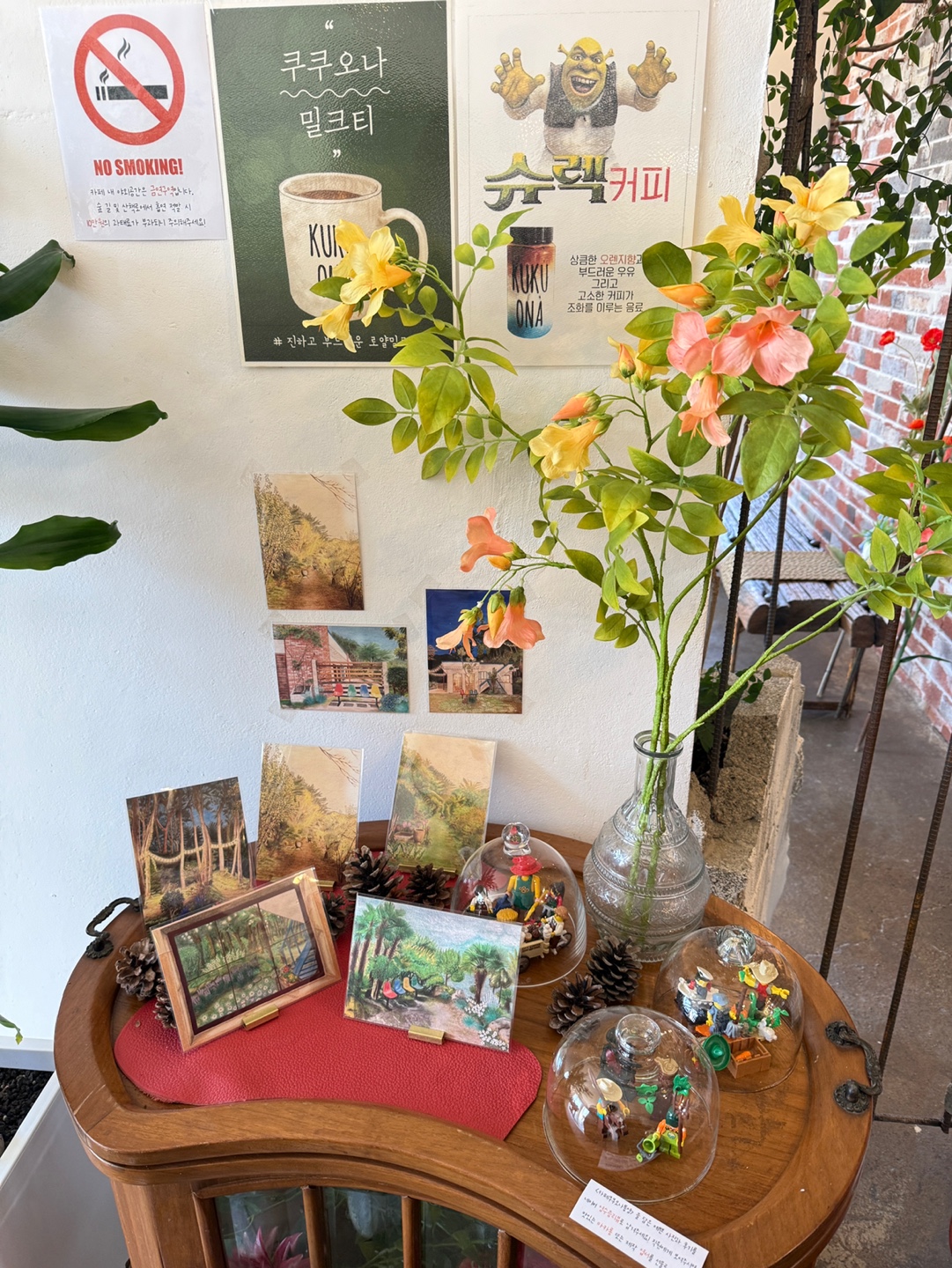 외관은 심플하지만, 안으로 들어가면 따뜻한 햇살과 초록 식물, 고풍스러운 테이블과 의자가 어우러진 감성 인테리어가 펼쳐져요. 곳곳에 작은 전시와 엽서, 소품이 있어 눈도 즐겁고, 사진 찍기도 좋아요.